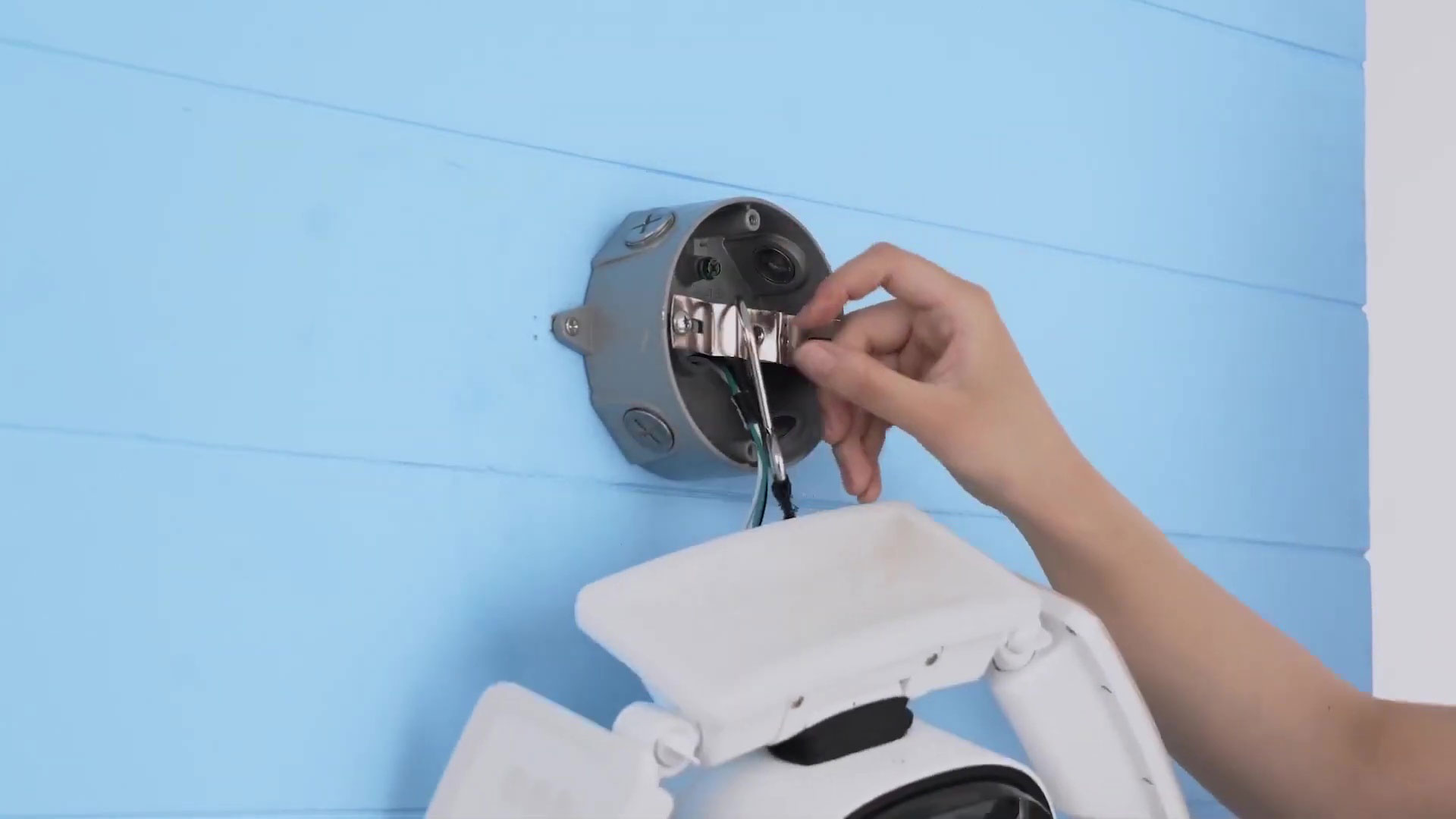 Utilizzando un trapano e le viti in dotazione, bisogna fissare la piastra rettangolare di montaggio, collegare i cavi alla rete elettrica e quindi fissare la telecamera alla piastra.
