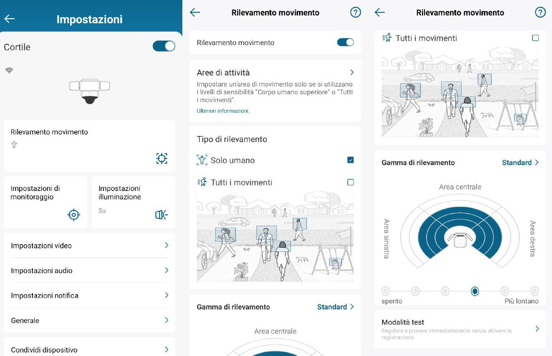 Apprezzabile quanto se non più della qualità video, sono i sensori a lungo raggio a bordo, in grado di rilevare qualsiasi movimento, e, attraverso l’IA (intelligenza artificiale), stabilire se si tratta di un essere umano, nel qual caso, la cam “aggancia il soggetto” e lo segue, facendo partire la registrazione video, oltre ad una notifica sullo smartphone. È possibile settare il raggio d’azione (più o meno vicino alla cam), decidere se attivare la rilevazione per qualunque tipo di movimento, anche non umano (es. animale), e di individuare zone (fino a 2) esclusive dove effettuare la rilevazione, così da ridurre gli avvisi di movimento non necessari.