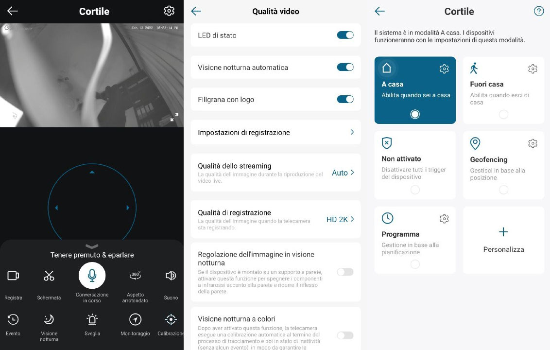 Nella scheda Sicurezza è possibile scegliere con quale modalità far funzionare la cam: A casa, Fuori casa, Non attivata, Geofencing (in base alla posizione), Programma (in base a giorno e ora), ognuna delle quali ha determinate caratteristiche in relazione a Registrazione video, Notifica push e Allarme (presente nella cam una sirena da 100dB).