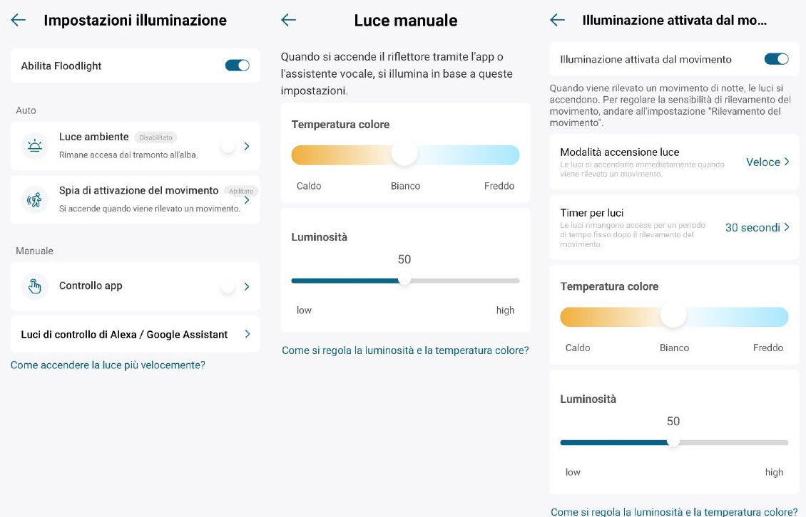 Toccando l’icona Impostazioni, nell’angolo in alto a destra, si accede a vari settaggi, tra cui illuminazione e qualità video. È possibile anche attivare/disattivare la cam, la visione notturna automatica e altro ancora.