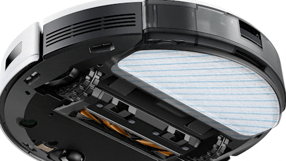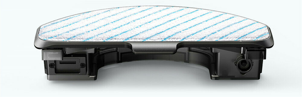 Nella parte inferiore, ci sono la spazzola marginale, posizionata a sinistra, che sposta la sporcizia dalle aree periferiche verso la bocchetta di aspirazione centrale, un ruotino universale, le placchette metalliche per la ricarica e 6 sensori anti caduta. Sono inoltre visibili 3 fori di scarico dell’acqua in corrispondenza dell’area di fissaggio della piastra oscillante per lavare i pavimenti. Ci sono anche una spazzola rotante centrale, in setole e gomma, e due ruote gommate ammortizzate che permettono al robot di sollevarsi per superare piccoli scalini e salire sui tappeti.