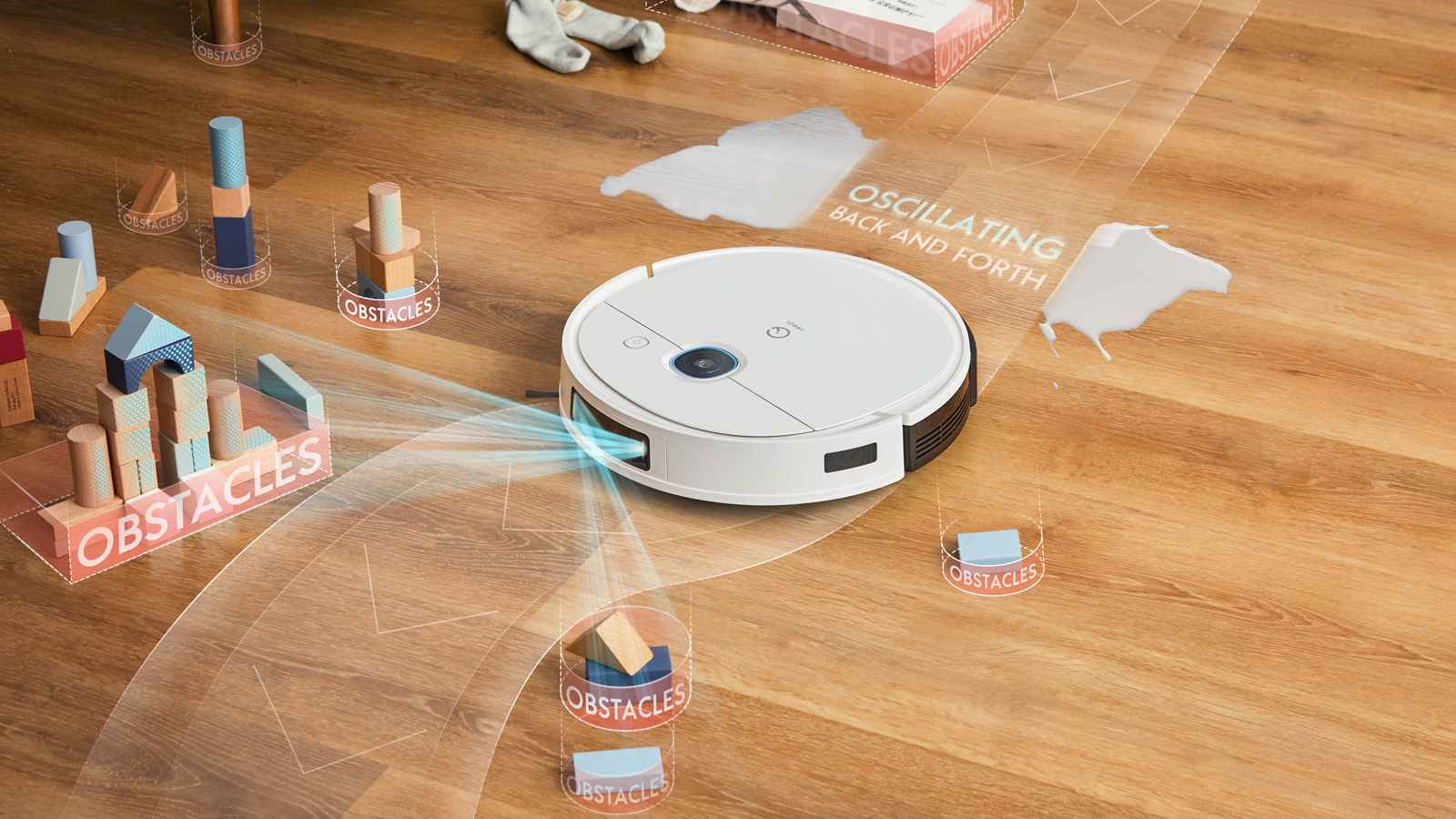 Lungo il bordo laterale, c’è un sensore 3D che rileva ostacoli, così da evitare urti e cadute accidentali. Grazie al riconoscimento intelligente degli oggetti sul pavimento, il robot può pulire senza dover attendere che qualcuno sgombri il campo da scarpe, giocattoli e fili, che, come abbiamo verificato durante il nostro test, vengono dribblati come birilli.