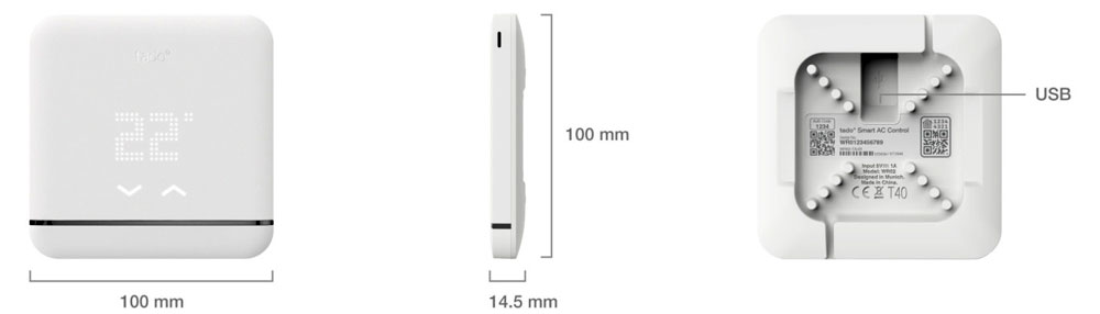 Visivamente, il V3+ si presenta come una piccola mattonella (A x L x P: 100 x 100 x 14.5 mm) realizzata in materiale plastico e quindi molto leggera (74 g). Sulla faccia anteriore, bianca con una sottile striscia nera lucente in corrispondenza della porta ad infrarossi, sono presenti un display a matrice LED (10 x 19 LEDs), che mostra le informazioni e le impostazioni attive (modalità, temperatura, velocità della ventola, ecc), ed una superficie tattile capacitiva (32 x 20 mm) per il controllo diretto del climatizzatore.