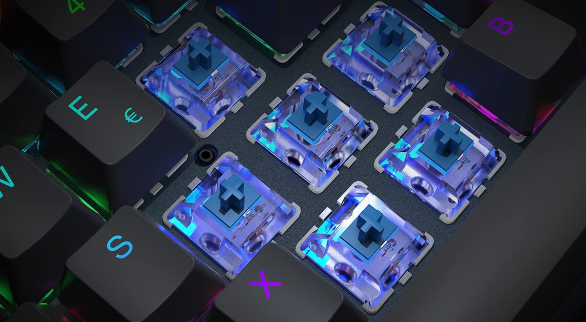 Gli interruttori meccanici sottostanti, rossi o blu, sono testati per arrivare fino a 50 milioni di battute, garantendo così prestazioni a lungo termine. Come sperimentato durante il nostro test, offrono un key travel (escursione tasti) soddisfacente e un feedback rapido e preciso con un clic udibile e una piacevole sensazione tattile.