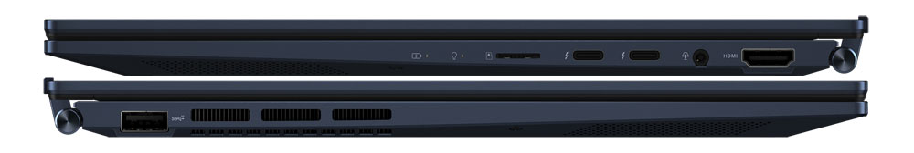 Lungo il bordo laterale, sulla destra, due porte USB-C, entrambe Thunderbolt 4, che supportano anche la ricarica PD e DisplayPort. Presenti, inoltre, una porta USB-A (un’altra è sul bordo sinistro), un jack combinato per cuffie/microfono da 3,5 mm e un lettore di schede MicroSD.