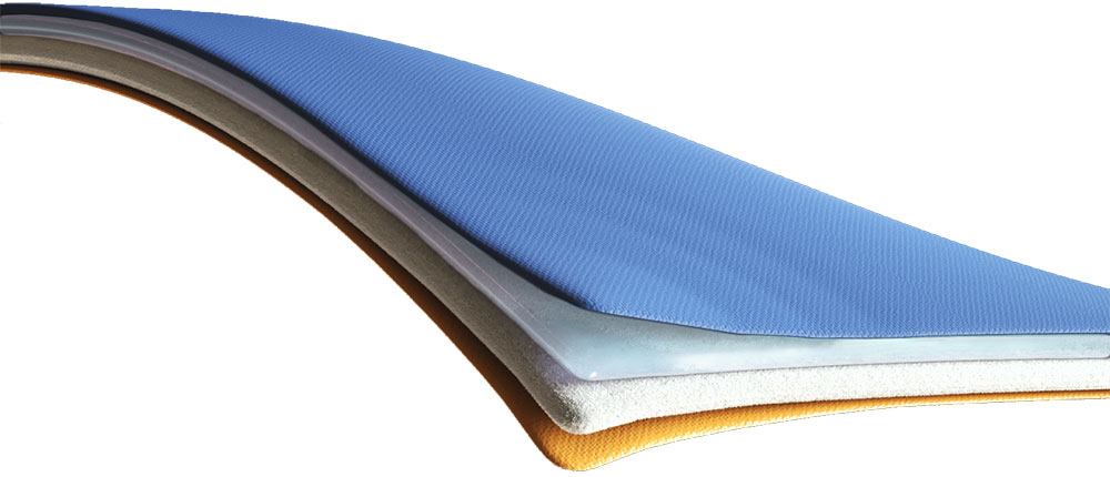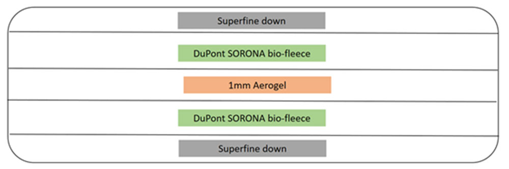 Al di sotto, come nella trapunta, uno strato da 1 mm di aerogel e uno di bio-pile DuPont SORONA.