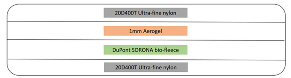 Oltre allo strato centrale da 1 mm di aerogel, la superficie esterna è un pile in poliestere, morbido e delicato sulla pelle come la seta. È resistente all’usura, non facile da rompere e non soggetto a pilling e restringimento. Trattandosi di un pile superfine ha meno probabilità di generare elettricità statica rispetto a un normale pile.
