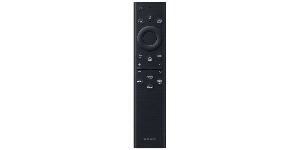 Il telecomando, One Remote, elegante e arrotondato, include un microfono per gli assistenti vocali (Bixby, Google Assistant e Amazon Alexa) e pulsanti dedicati per i principali servizi di streaming (Netflix, Amazon Prime Video, Disney+ e Samsung TV Plus). Funziona via Bluetooth e integra una batteria ricaricabile tramite un pannello solare posto sul retro, via USB-C o attraverso le onde radio Wi-Fi.