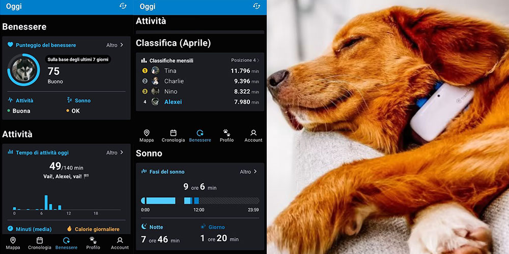 Oltre ai dati di posizione, il Dog 4 fornisce un punteggio del benessere che mostra come se la passa il nostro cane sulla base dei dati relativi all’attività fisica e alla qualità del sonno raccolti negli ultimi 7 giorni.