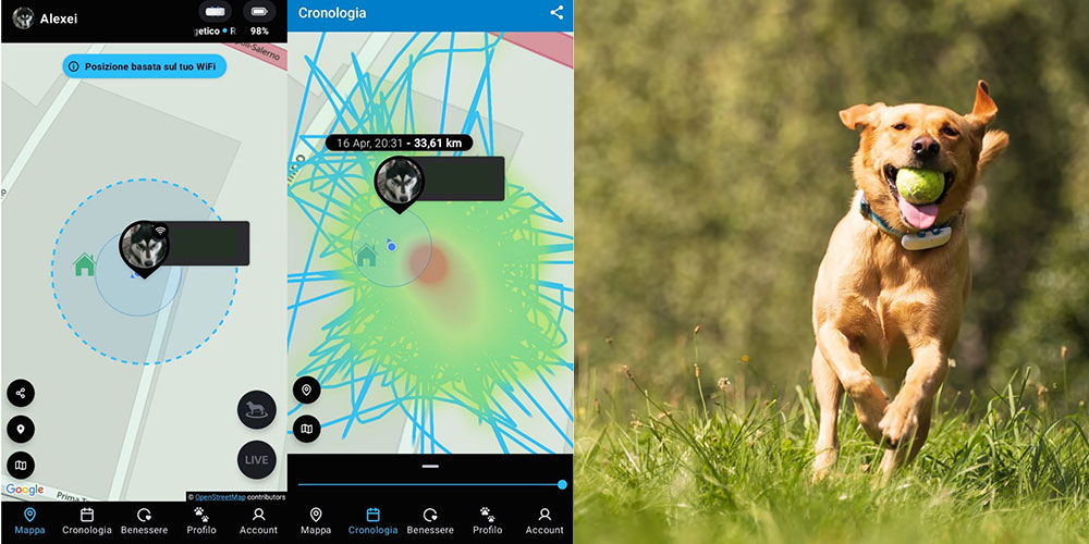 Attraverso l’app, dotata di interfaccia intuitiva, è possibile visualizzare, in qualsiasi momento e dovunque ci si trovi, la posizione del cane su una mappa, impostare recinti virtuali e ricevere un alert quando il cane esce o entra in queste zone. A disposizione anche la cronologia delle posizioni dall’animale durante un certo lasso di tempo. In questa schermata oltre a vedere la traccia dei percorsi fatti è possibile abilitare l’opzione Heatmap, che indica, attraverso tre colorazioni (verde, giallo e rosso), le zone in cui il cane trascorre più tempo.