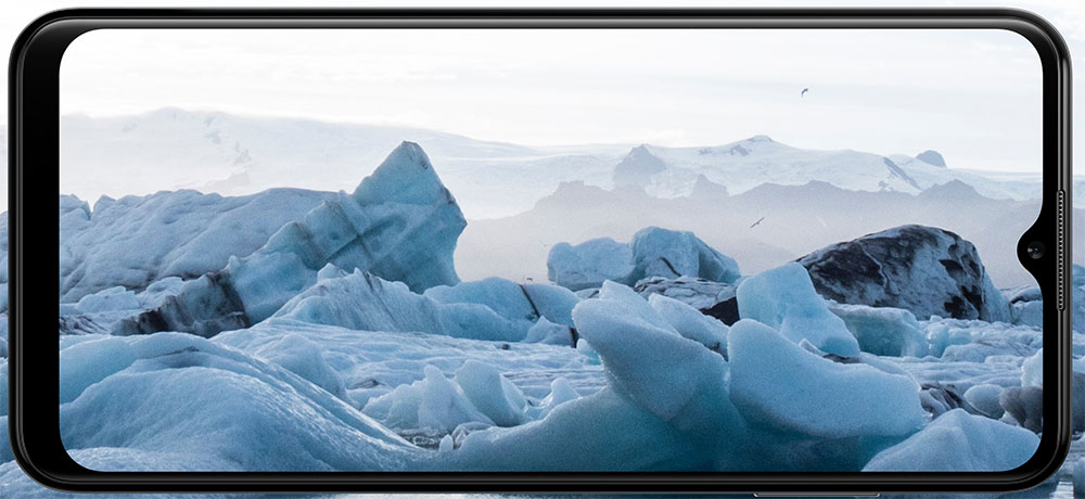 La faccia anteriore è in buona parte (82,8% screen-to-body ratio) occupata da uno schermo formato 20:9, che ha cornici non sottilissime (soprattutto in basso) e, in alto al centro, presenta un notch a goccia per la cam frontale. I sensori di prossimità e di luminosità ambientale sono in corrispondenza della griglia in metallo della capsula auricolare, appena visibile al centro della cornice superiore. Il parco sensori è completato da accelerometro, giroscopio e bussola elettronica.