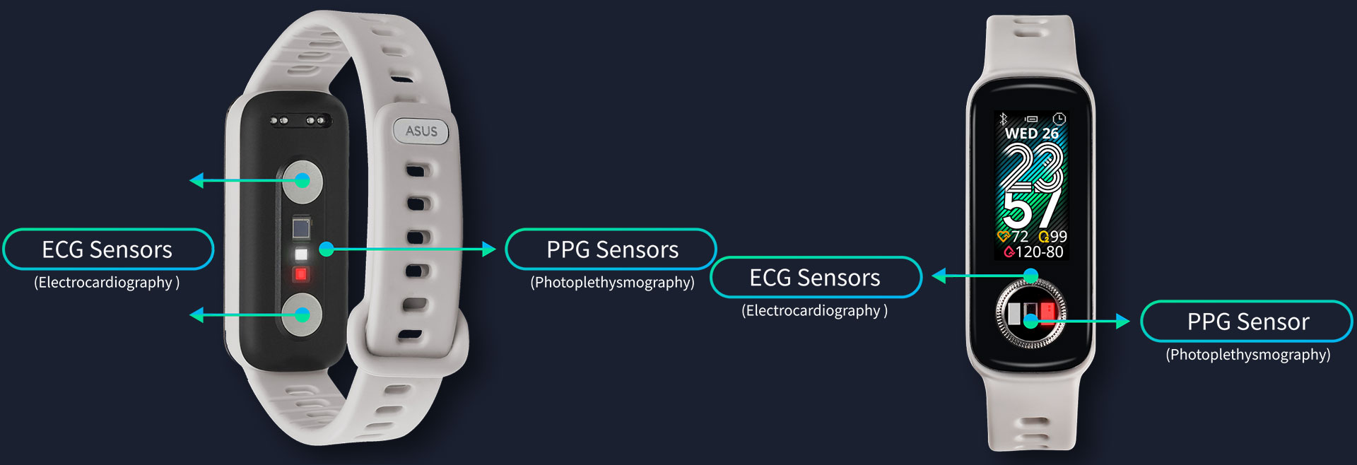 A questa categoria appartiene il VivoWatch 5 AERO di Asus, la prima smartband ad integrare sensori di livello medico sia ottici (per EPG) che microelettrici (per ECG).