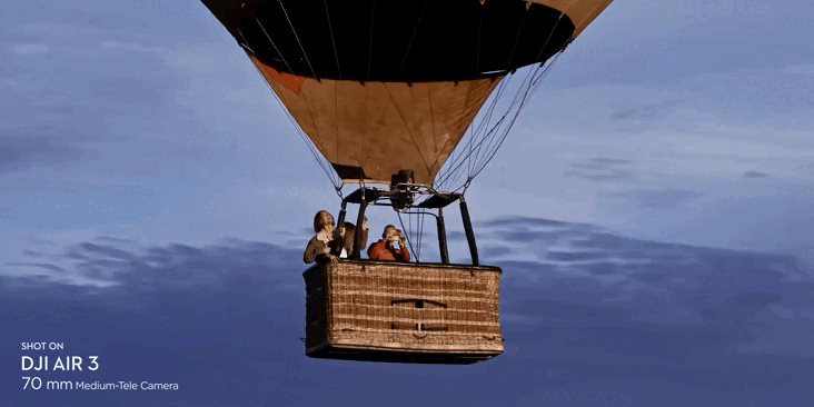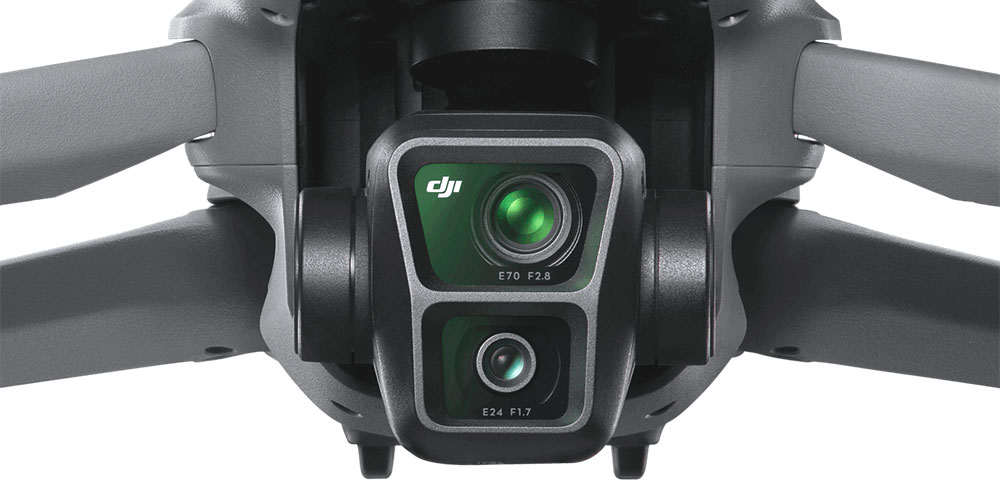 Il DJI Air 3 è dotato di due fotocamere, entrambe con sensori CMOS da 1/1.3 pollici. La fotocamera inferiore ha una lunghezza focale di 24 mm, mentre quella superiore offre uno zoom 3x con una lunghezza focale di 70 mm.