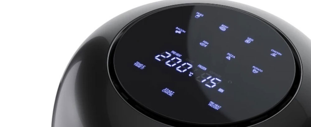 Caratterizzata da un design sofisticato, realizzata in plastica lucida di colore nero, di dimensioni compatte (261x327x338 mm), la GS404 è dotata di un pannello di controllo soft-touch e un display digitale intuitivo che semplificano l’impostazione dei programmi e della temperatura. La friggitrice si adatta alle diverse esigenze culinarie offrendo 8 impostazioni di cottura preimpostate per vari alimenti come manzo, pollo, pesce, patate, verdure, pancetta, patatine e pizza.