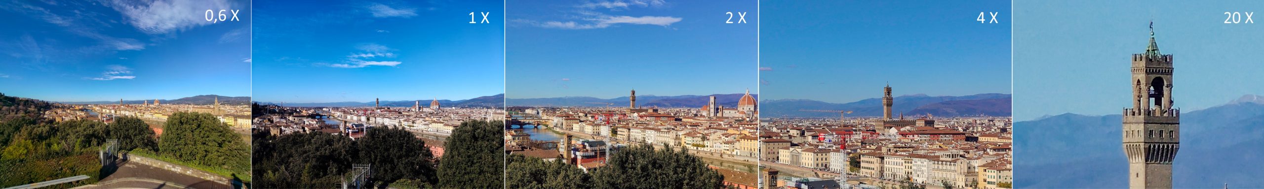 Questi tre obiettivi combinati offrono versatili funzionalità di zoom con ingrandimenti a 0,6X, 1X, 2X e 4X. In aggiunta è presente anche uno zoom digitale 20X.