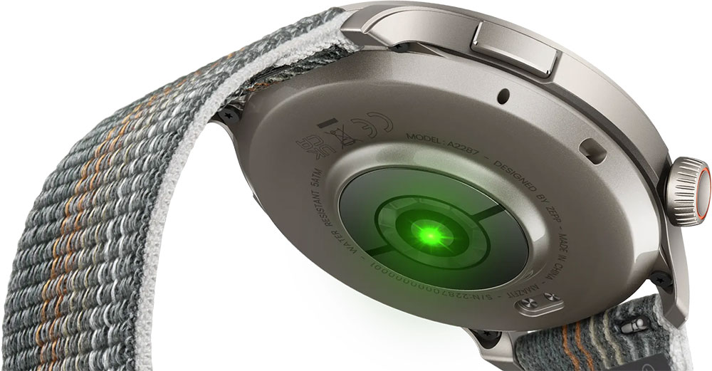 Sul retro del dispositivo sono posizionati i sensori, inclusi quelli per il monitoraggio della salute come il PPG di quinta generazione. La ricarica avviene attraverso due contatti concavi nella parte superiore.