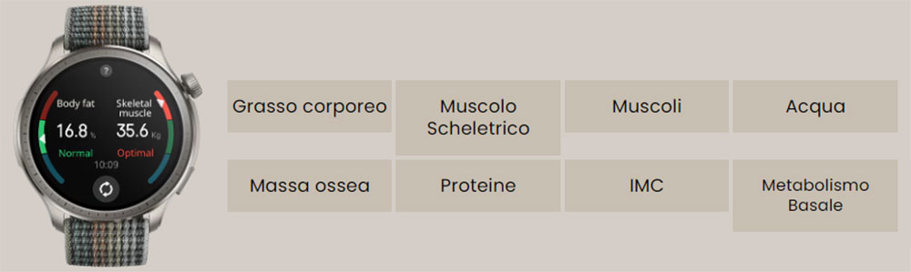 Grazie alla nuova funzione di misurazione della composizione corporea (Body Composition), il Balance offre la possibilità di misurare rapidamente e facilmente, direttamente dal polso, una serie di parametri cruciali, tra cui la percentuale di grasso corporeo, il muscolo scheletrico, la massa muscolare, la quantità di acqua corporea, la massa ossea, le proteine, l’IMC (Indice di Massa Corporea) e il metabolismo basale. Questi dati sono relativi alla parte superiore del corpo.