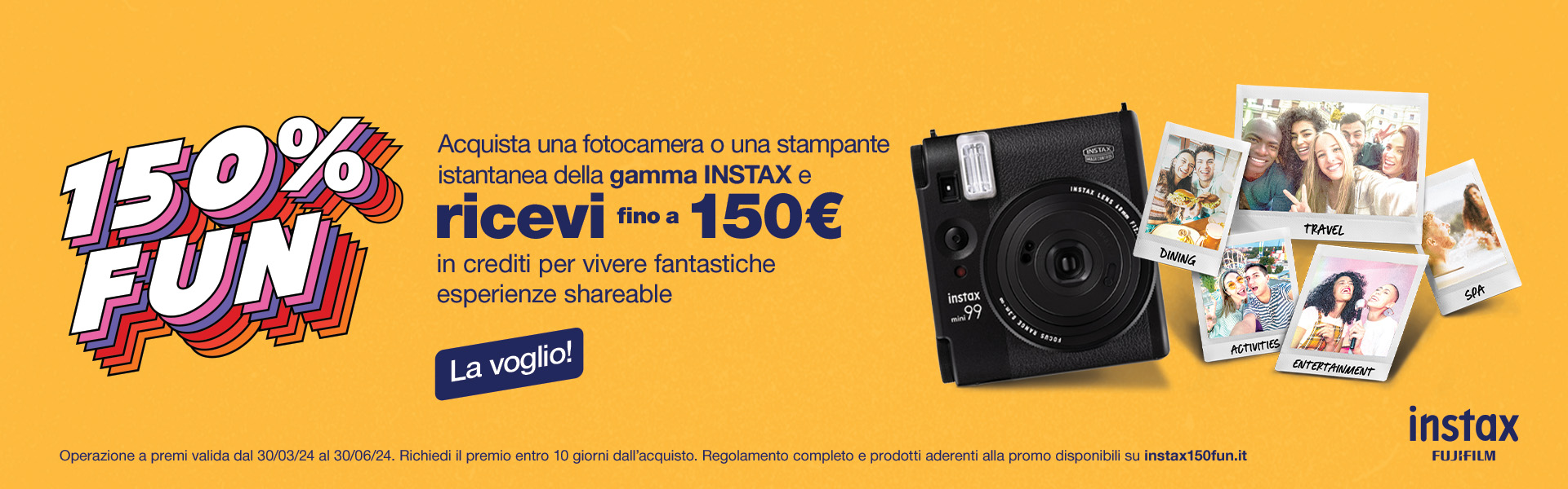 Fino al 30 giugno chi acquista questa fotocamera riceverà 150 euro in crediti per vivere piacevoli esperienze come cene gourmet, avventure di viaggio, divertimento in parchi a tema, serate karaoke e molto altro ancora.