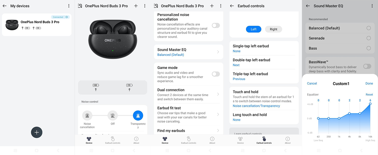 L’app consente di regolare tutte le funzionalità disponibili sugli auricolari, comprese le impostazioni ANC, con la possibilità di scegliere tra i tre livelli di intensità e la modalità Smart. È presente anche una funzionalità di cancellazione del rumore personalizzata, che valuta il livello di rumore ambientale e la forma dell’orecchio, creando un profilo ANC ad hoc. Inoltre, si possono personalizzare i comandi touch, per adattare l’esperienza d’uso alle proprie preferenze scegliendo azioni per doppio, triplo tocco e pressione prolungata.