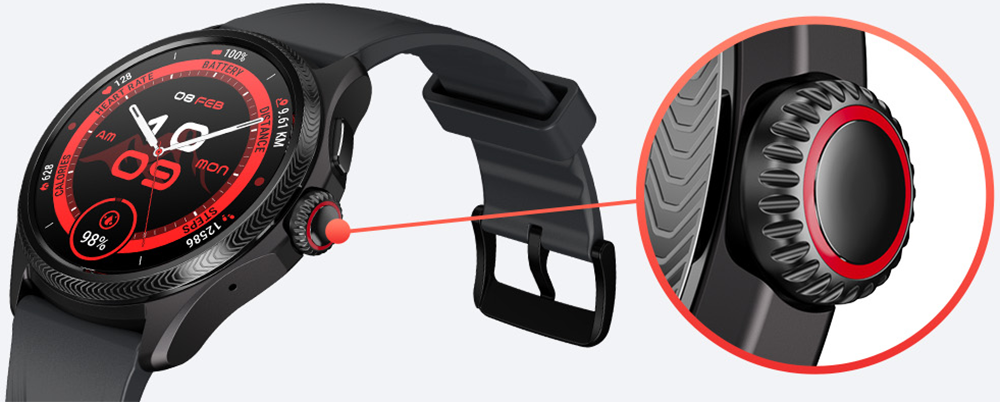 Sul bordo destro della cassa, sono presenti una grande corona rotante con un elegante inserto rosso e un pulsante in acciaio. Entrambi sono comodi, facilmente accessibili e reattivi. Il pulsante è personalizzabile nelle impostazioni, permettendo di aggiungere funzionalità specifiche per un’esperienza d’uso ottimizzata. Oltre ai controlli fisici, per interagire con lo smartwatch è possibile sfruttare lo schermo touch.
