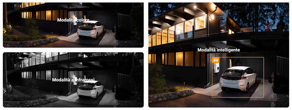 La telecamera offre diverse modalità di visione notturna: infrarossi, a colori e una modalità intelligente che combina le due. In modalità infrarossi, è in grado di catturare immagini dettagliate anche in totale oscurità, fino a una distanza di 10 metri. Per chi desidera una visione notturna a colori, è possibile attivare i faretti integrati, che illuminano l’area garantendo una visibilità notturna paragonabile a quella diurna. La modalità intelligente, invece, consente alla telecamera di passare automaticamente dalla visione in bianco e nero a quella a colori quando rileva un movimento, ottimizzando così il consumo energetico.