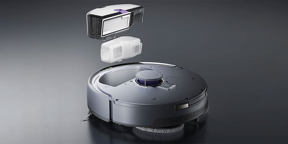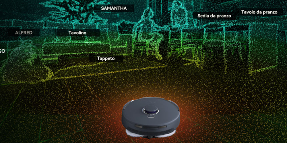 Il robot mantiene la classica struttura circolare, con una piccola torretta al centro della faccia superiore che ospita la tecnologia di navigazione LiDAR 4.0 che esegue scansioni a 360° della casa per generare una mappa 3D dettagliata a 4 livelli e pianificare il percorso ottimale. Accanto a essa si trovano due pulsanti: uno serve per avviare e arrestare il robot, l’altro, il pulsante home, permette di rimandarlo alla base.