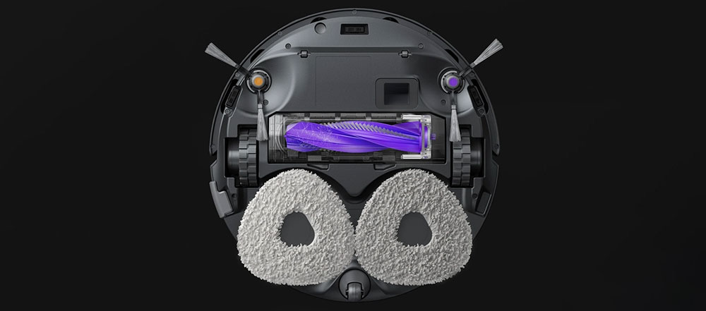 Nella parte inferiore, oltre a due spazzole laterali, si trovano anche due mop rotanti triangolari. Al centro c’è la bocchetta di aspirazione, dotata di una spazzola flottante zero grovigli che impedisce a peli e capelli di avvolgersi attorno.