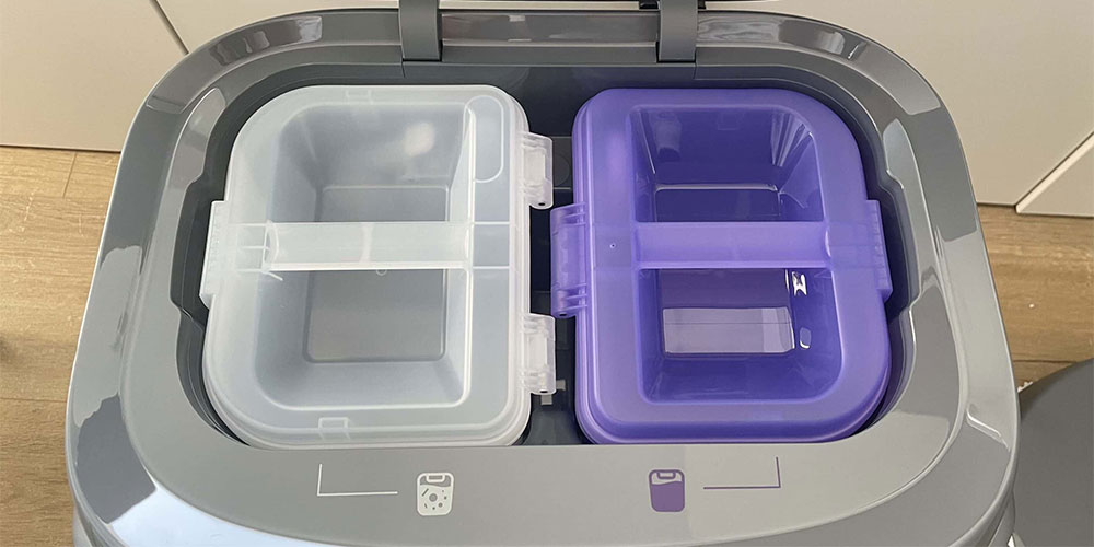 Sotto il coperchio si trovano i serbatoi removibili per l’acqua sporca e per l’acqua pulita, con una capacità rispettivamente di 4,5 e 5 litri. Entrambi sono dotati di chiusura ermetica anti-sgocciolamento per prevenire la fuoriuscita di liquidi. Sono inoltre progettati per evitare la formazione di cattivi odori causati dall’acqua sporca residuo del lavaggio dei moci del robot.