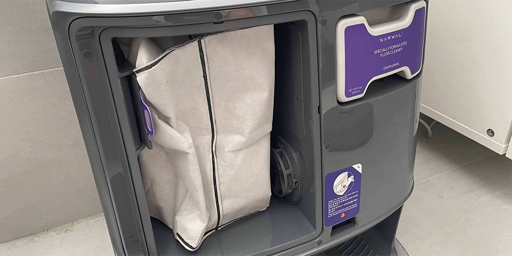 Rimuovendo il coperchio anteriore della stazione, si accede al sacchetto per la polvere da 2,5 litri. Con il Freo Z Ultra, Narwal ha infatti deciso di integrare una funzione di aspirazione direttamente nella stazione base. Nel Freo X Ultra il sacchetto per la polvere è, invece, integrato all’interno del robot. Sebbene questi sacchetti abbiano una capacità aumentata grazie a una speciale funzione di compressione, il loro costo è piuttosto elevato. Il nuovo sistema implementato nel Freo Z Ultra riduce sensibilmente i costi, visto che i sacchetti sono significativamente più economici e possono durare fino a 120 giorni.