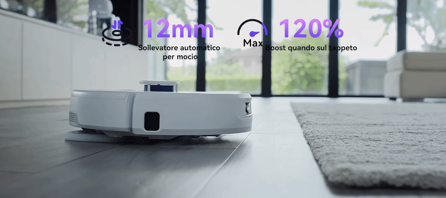 Quando si sceglie l’opzione ‘Aspira e lava’, il robot solleva automaticamente i moci di 12 mm quando passa sui tappeti. Questa è una soluzione perfetta, a meno che non si abbiano tappeti a pelo lungo.