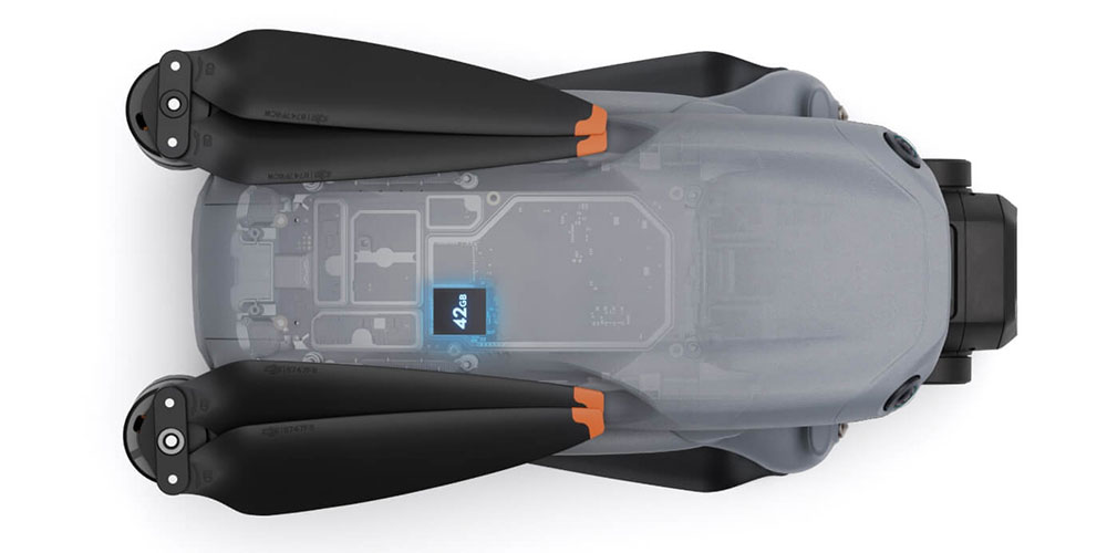 Un’altra caratteristica degna di nota dell’Air 3S è la memoria interna da 42 GB, che riduce la necessità di utilizzare schede microSD, offrendo ampio spazio per archiviare foto e video di alta qualità.