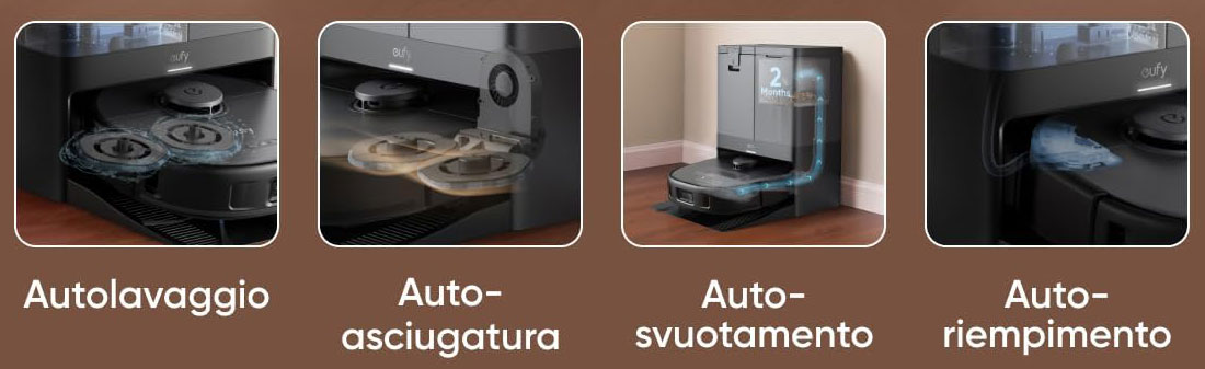 La stazione base è progettata per offrire una serie di funzionalità avanzate, tra cui l’autopulizia dei mop con lavaggio automatico e asciugatura ad aria a 45°C, lo svuotamento del raccoglitore della polvere trasferendo i detriti in un sacchetto da 2,5 litri da sostituire all’incirca ogni due mesi, e una gestione integrata dell’acqua attraverso serbatoi separati per acqua pulita e sporca. Il serbatoio dell’acqua pulita da 3 litri è sufficiente per pulire 2-3 volte una casa di 150 m².