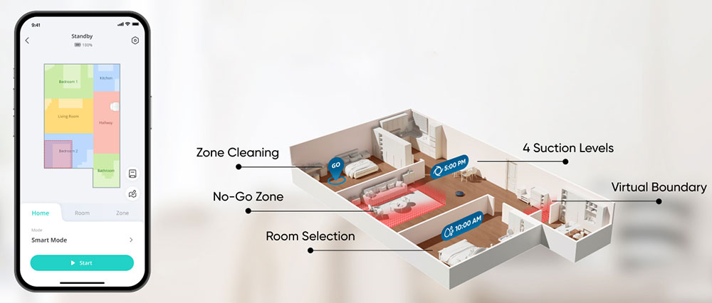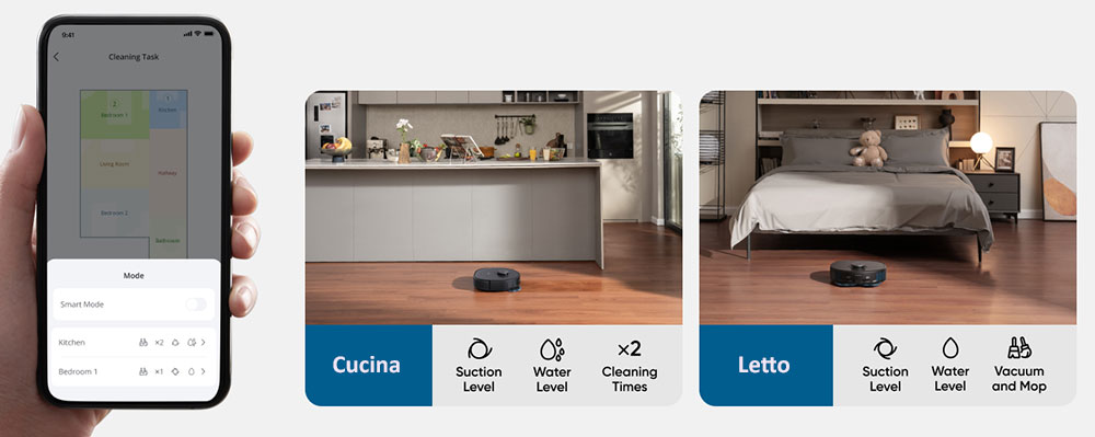 L’app eufy Clean, disponibile per iOS e Android, si distingue per la sua facilità d’uso e le opzioni avanzate di personalizzazione.