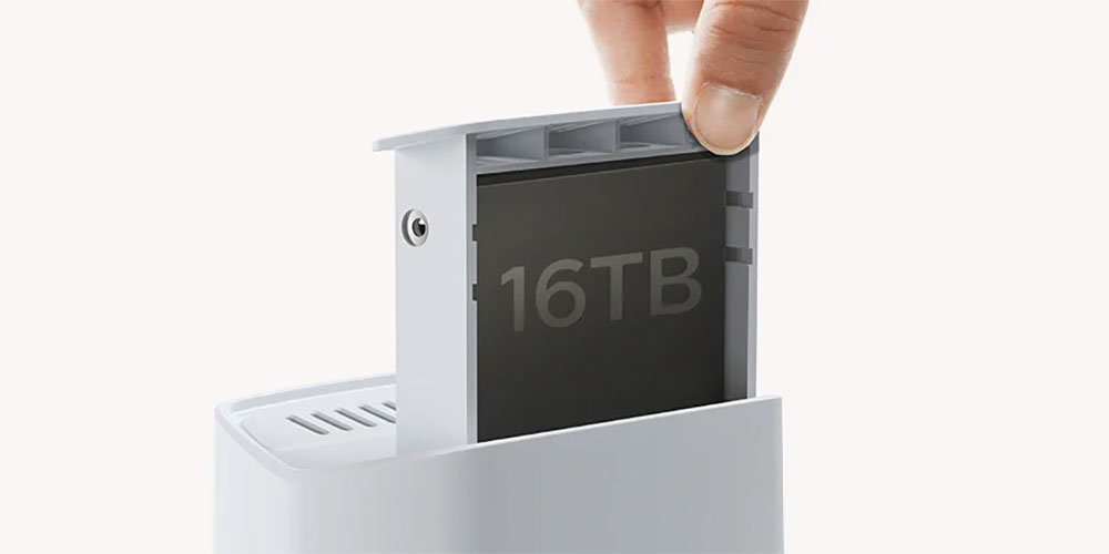 La parte superiore è removibile e consente di inserire un HDD o SSD SATA da 2,5 pollici fino a 16 TB, espandendo così i 16 GB di memoria interna per l’archiviazione video.