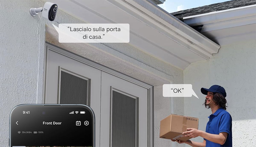 Ogni telecamera è dotata di un faretto da 100 lumen e una sirena da 85 dB per dissuadere eventuali intrusi.