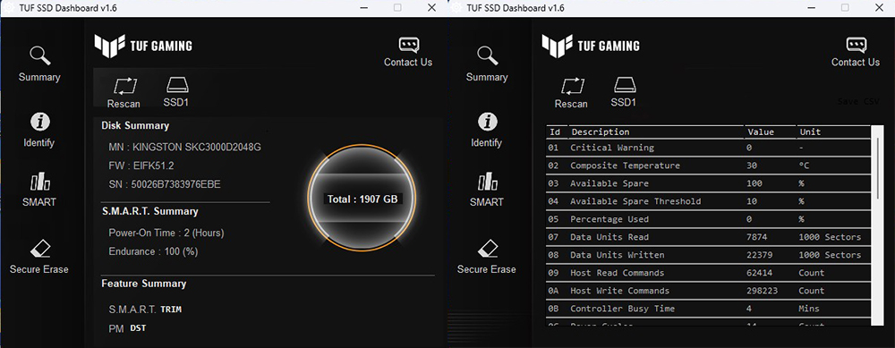 TUF Gaming A2 supporta anch’esso SSD M.2 sia SATA che NVMe PCIe, offrendo in più un software dedicato, il TUF Gaming SSD Dashboard Utility. Questo programma, che gira solo su Windows, permette di monitorare in tempo reale lo stato dell’unità, visualizzare informazioni tecniche dettagliate e gestire l’eliminazione dei dati attraverso una funzione di cancellazione sicura.