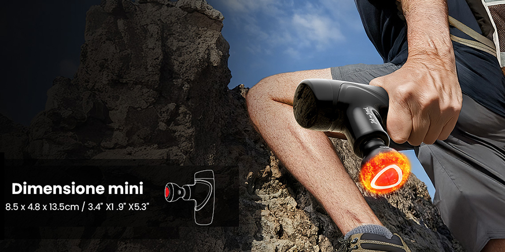 Il dispositivo è leggero e molto compatto: pesa circa 400 grammi e misura 13,5 × 8,5 × 4,8 cm, dimensioni decisamente inferiori rispetto a quelle delle pistole massaggianti tradizionali.