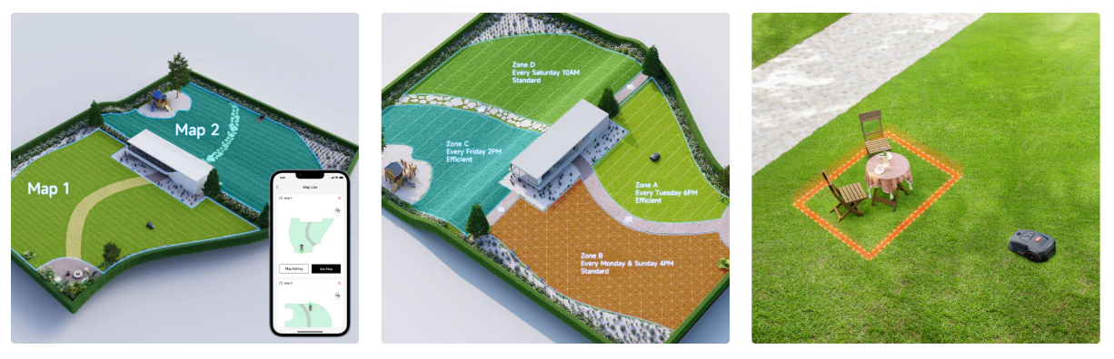 Da segnalare che il 600 è progettato anche per le case con giardini anteriori e posteriori disgiunti, consentendo di creare e gestire due mappe indipendenti. Tracciate le mappe, è possibile definire con precisione la zona di lavoro, disegnare aree proibite (le cosiddette “no-go zone”) e impostare nel dettaglio il calendario settimanale delle sessioni di taglio.