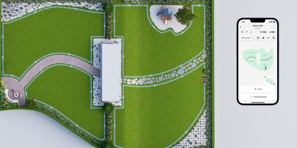 La mappatura dell’area si effettua in modo intuitivo, guidando manualmente il robot sul prato come fosse un’auto radiocomandata, seguendo il perimetro desiderato.