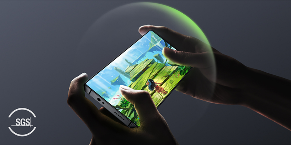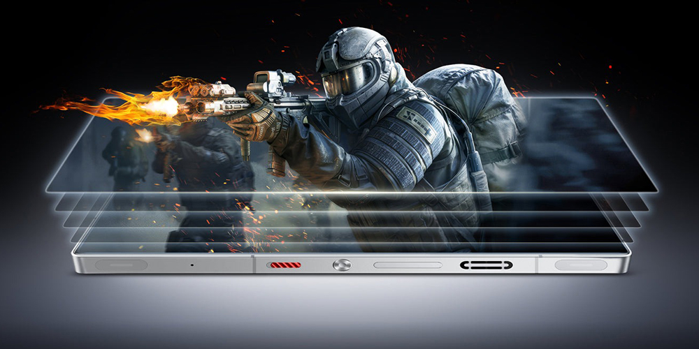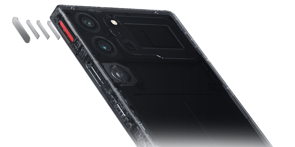Il frame laterale in alluminio anodizzato aeronautico integra due trigger capacitivi con latenza di 7,4 ms, caratterizzati da touch sampling a 520 Hz e da luci RGB personalizzabili, un tasto fisico programmabile (Magic Key), un sensore a infrarossi, jack audio, due microfoni, tasto di accensione circolare, bilanciere del volume, due aperture per ventole,