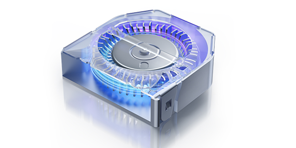 una ventola interna con pale a pinne di squalo capace di raggiungere i 23.000 giri al minuto,