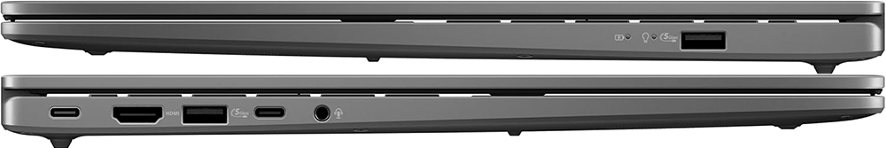 L’estetica del Vivobook S16 è uno dei suoi punti di forza. La scocca, realizzata con una combinazione di alluminio e plastica, si distingue per la colorazione “Matte Gray”, una finitura opaca grigio scuro, elegante e discreta, perfetta tanto per l’ufficio quanto per il tempo libero.