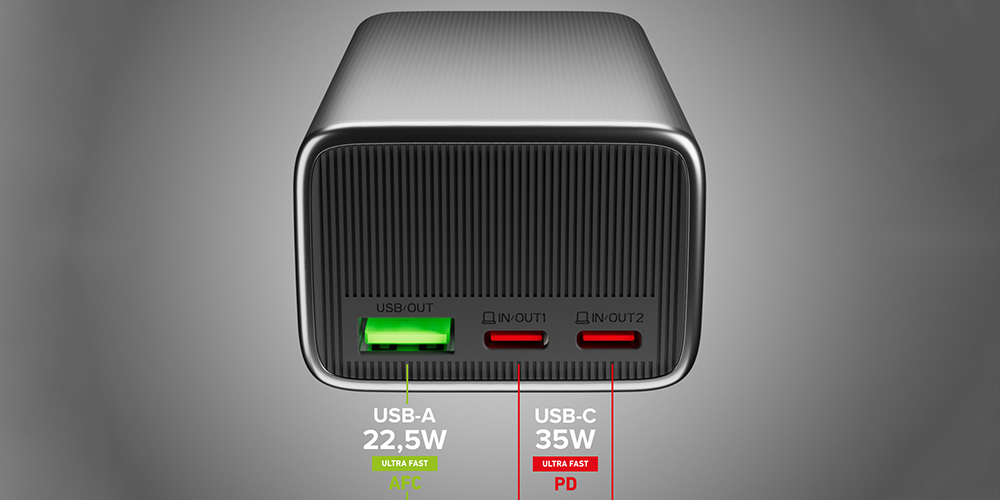 A bordo sono presenti due porte USB-C con Power Delivery fino a 35 W e una porta USB-A con tecnologia Adaptive Fast Charge fino a 22,5 W.