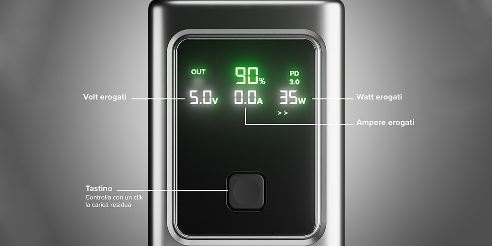 A distinguere questo power bank da molti suoi concorrenti è il display LCD integrato. Non è un semplice dettaglio estetico, ma uno strumento utile che consente di conoscere con precisione la percentuale di carica residua, oltre a Volt, Ampere e Watt erogati. Basta sfiorare il pulsante di accensione e lo schermo si illumina, mostrando in modo chiaro ed immediato tutti i dati. Un gesto semplice che sostituisce l’incertezza delle classiche spie a LED e offre all’utente il pieno controllo della propria energia.