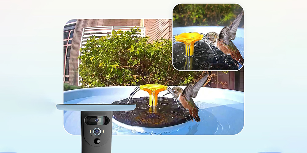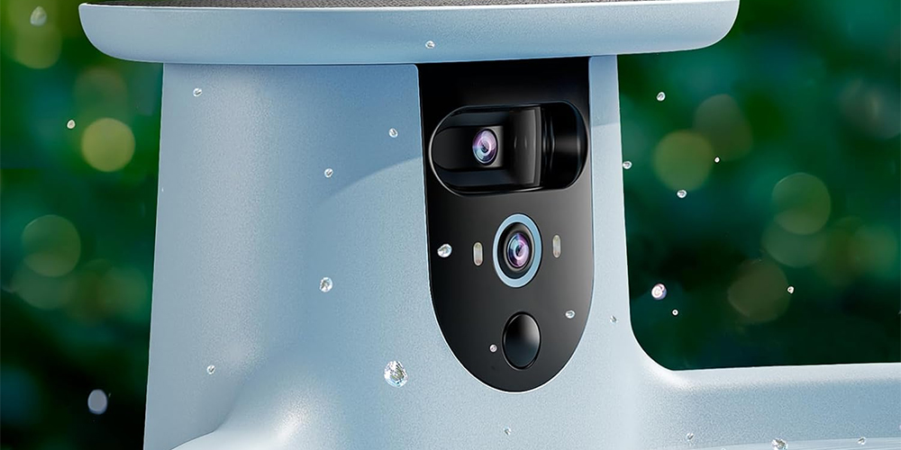 Il cuore tecnologico è la camera a doppia lente: una grandangolare da 2 MP a 1080P che riprende la scena complessiva e una “portrait” da 3 MP che si concentra sui soggetti più vicini, regalando immagini in 2K. Il risultato, nei nostri test, è di buona qualità: dettagli nitidi, colori fedeli, un’ottima gestione della luce anche in giornate nuvolose. La fotocamera è racchiusa in una scocca compatta, protetta da una guarnizione IP66 che la rende impermeabile alla pioggia e agli schizzi provenienti dalla fontana. Il trattamento idrofobico della lente evita che le gocce d’acqua distorcano l’immagine — una soluzione semplice ma efficace.
