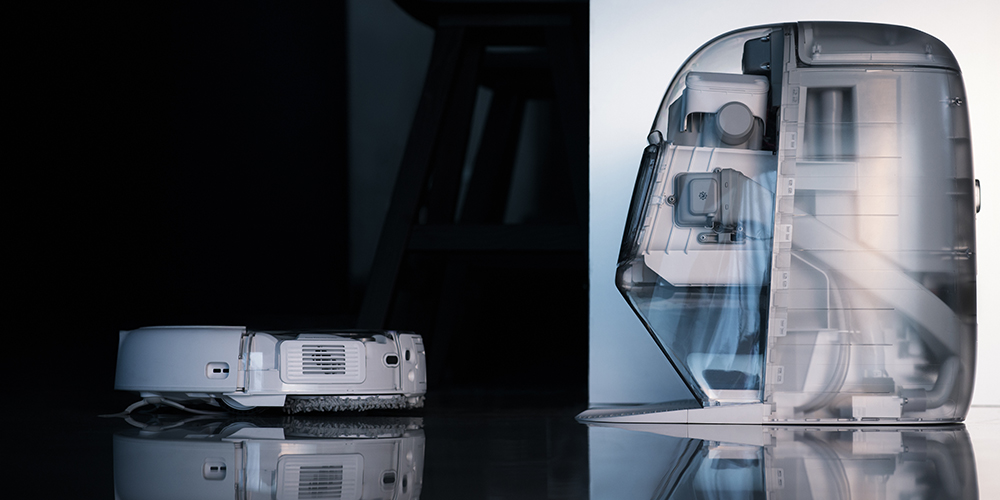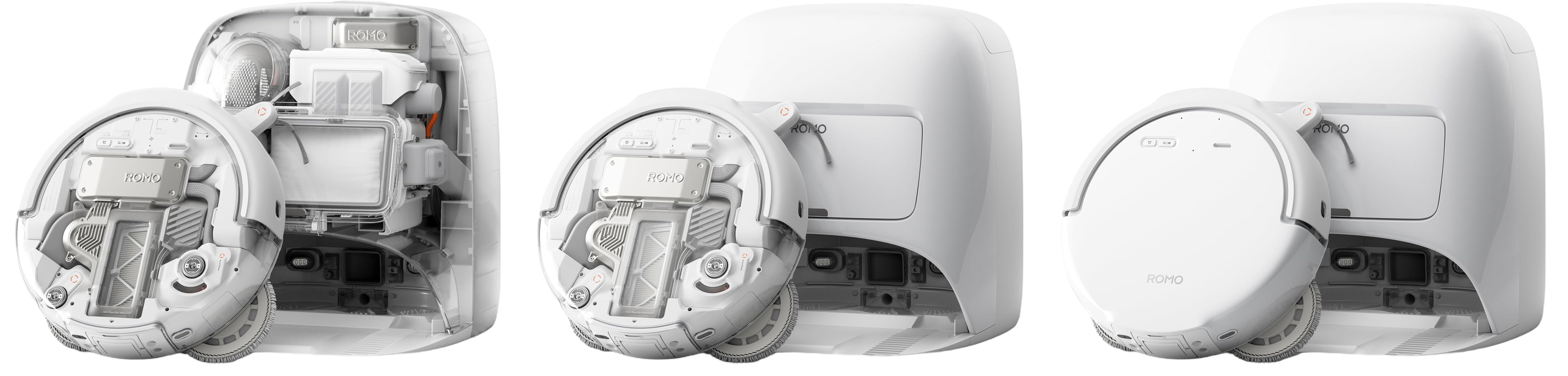 Abbiamo provato a lungo il Romo P, la versione più completa della nuova gamma, affiancata dai modelli Romo A e Romo S. La differenza si vede subito: il P sfoggia pannelli trasparenti sulla stazione base e sul corpo del robot, che lasciano intravedere la sistemazione quasi maniacale dei componenti interni.