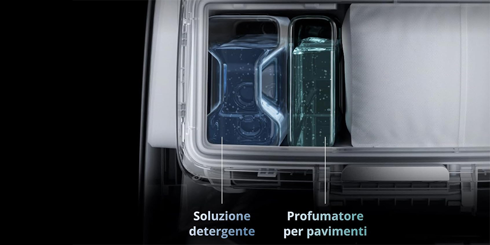 Un’esclusività del modello P è data dal vano dedicato al profumatore per pavimenti, che affianca la funzione detergente e aggiunge una dimensione sensoriale alla pulizia. Dopo ogni ciclo, la casa risulta non solo perfettamente pulita, ma anche fresca e gradevolmente profumata, senza gli odori artificiali dei detergenti tradizionali.