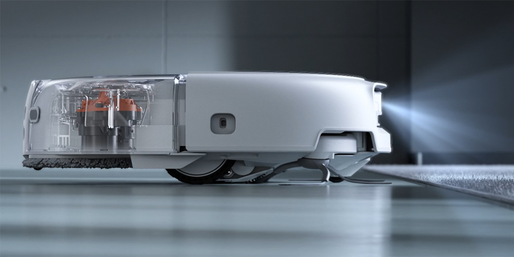 Quando il robot incontra un tappeto, i mop si sollevano automaticamente per evitare di bagnare le fibre.