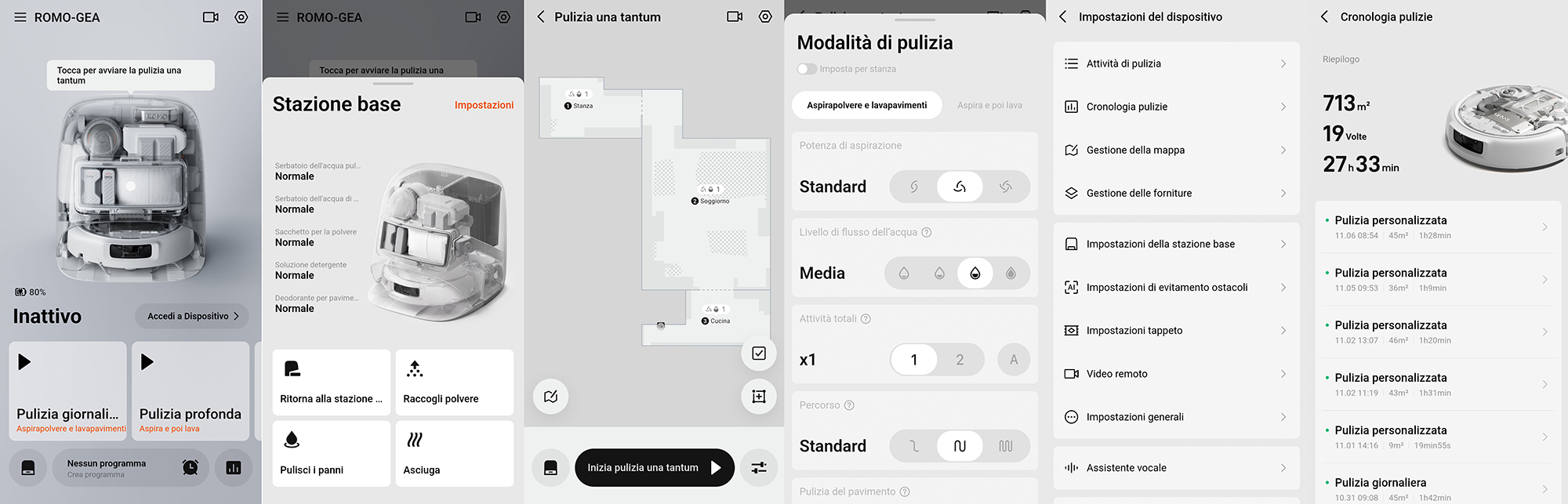 La pianificazione dei percorsi è uno dei punti di forza: Romo copre ogni area senza lasciare zone scoperte e, dopo pochi cicli, sembra quasi imparare la logica della casa, muovendosi con la naturalezza di un assistente domestico intelligente che conosce perfettamente il “proprio territorio”. Chi proviene da robot tradizionali noterà subito la differenza: Romo P non si limita a seguire percorsi preimpostati, ma interpreta il contesto, reagisce agli imprevisti e adatta ogni azione con una logica autonoma. È, in poche parole, un passo avanti nel concetto stesso di pulizia automatizzata. Romo adotta inoltre una sequenza di lavoro intelligente, spazzando sempre prima di lavare: la copertura delle spazzole laterali è più ampia rispetto al percorso dei mop, in modo da rimuovere lo sporco prima che entri in contatto con i panni umidi.