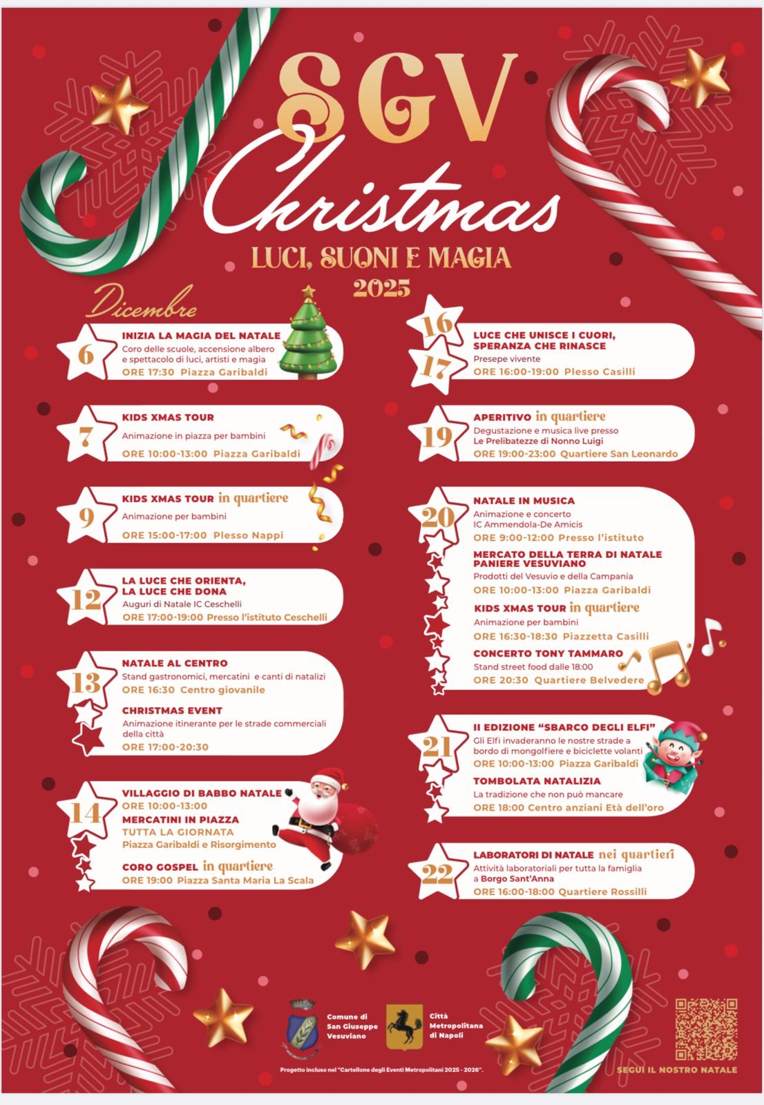 «SGV Christmas 2025 – aggiunge l’assessore agli Eventi e Cultura Andrea Ementato – è un programma pensato per valorizzare il senso di appartenenza e offrire eventi di qualità in ogni angolo della città. Abbiamo voluto coinvolgere scuole, quartieri e attività locali per costruire un Natale diffuso, vissuto insieme. Tra i tanti appuntamenti, sono particolarmente soddisfatto di poter ospitare nuovamente “Lo Sbarco degli Elfi”: un evento previsto per domenica 21 mattina e che trasforma la nostra piazza in un mondo fantastico per tutti i bambini. E poi avremo i mercatini di Natale e il Mercato della Terra, con i prodotti tipici e le eccellenze enogastronomiche campane. Ancora, il concerto di Tony Tammaro al Belvedere, il coro gospel a Santa Maria La Scala e tanti altri appuntamenti musicale. Infine, l’animazione per i più piccoli nelle strade del centro e della periferia. Invitiamo tutti i cittadini a partecipare e a vivere con noi queste settimane di festa».